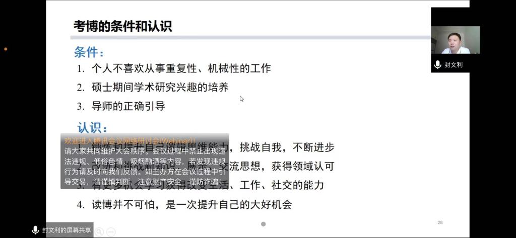 为激发我院研究生考博热情,鼓励同学们继续深造,不断提高学院研究生培养质量,环境学院于5月25日上午在腾讯会议线上召开第二期“厚德笃学·与榜样励新未来”考博动员讲座。本次讲座特别邀请周口师范学院副教授封文利老师主讲,学院李艳红副院长主持,116名硕士研究生积极参与此次会议。