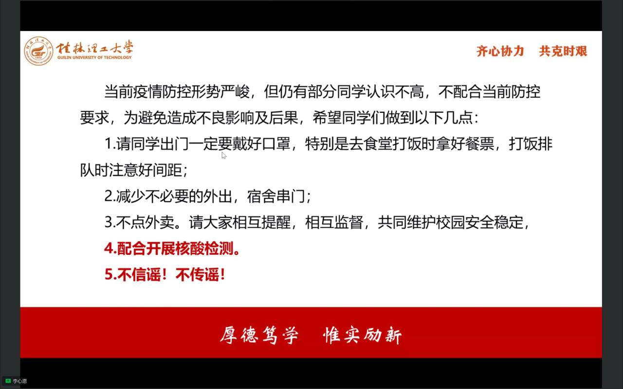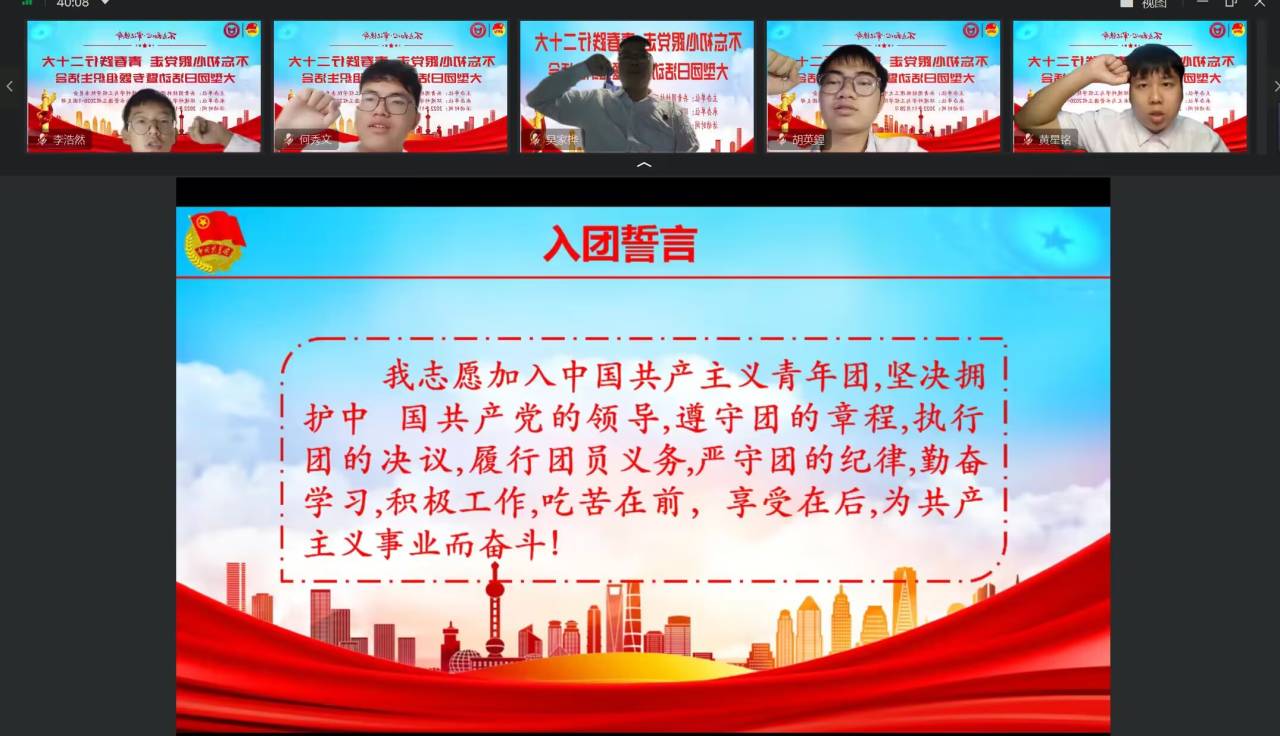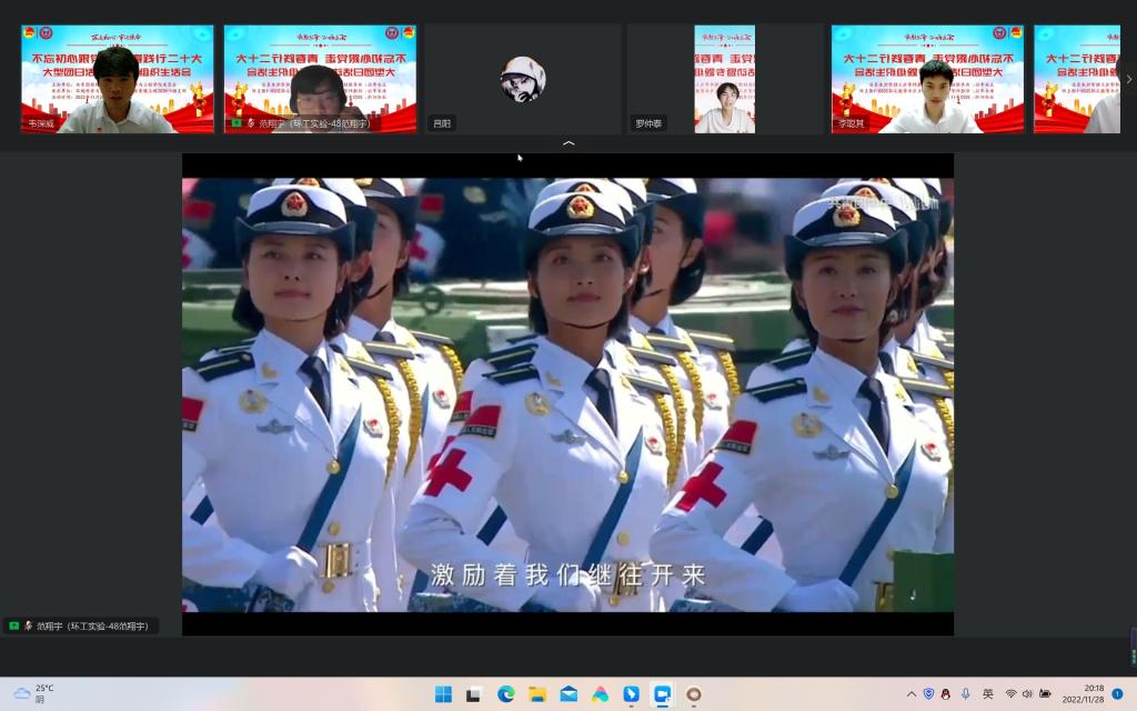 大会第一项,全体奏唱中国共青团团歌。随后,由水文与水资源2020-1班团支部书记孙仁和同学汇报团支部一年来开展“学习二十大、永远跟党走、奋进新征程”主题教育实践活动情况,团支部成员就学习贯彻党的二十大精神,结合个人思想和学习工作实际,交流学习体会、对标先进标准、查找差距不足、激发责任担当。接着,由团委书记李心愿老师围绕“齐心协力,共克时艰”开展思政大讲堂,分析当前我们所面临的来自疫情的严峻考验,让青年团员们看到我校党员教师勇担使命团结抗疫的身影,呼吁同学们理解并积极配合学校开展抗疫工作,向优秀党员学习,齐心协力,共克时艰。最后,大家在屏幕前重温入团誓词。