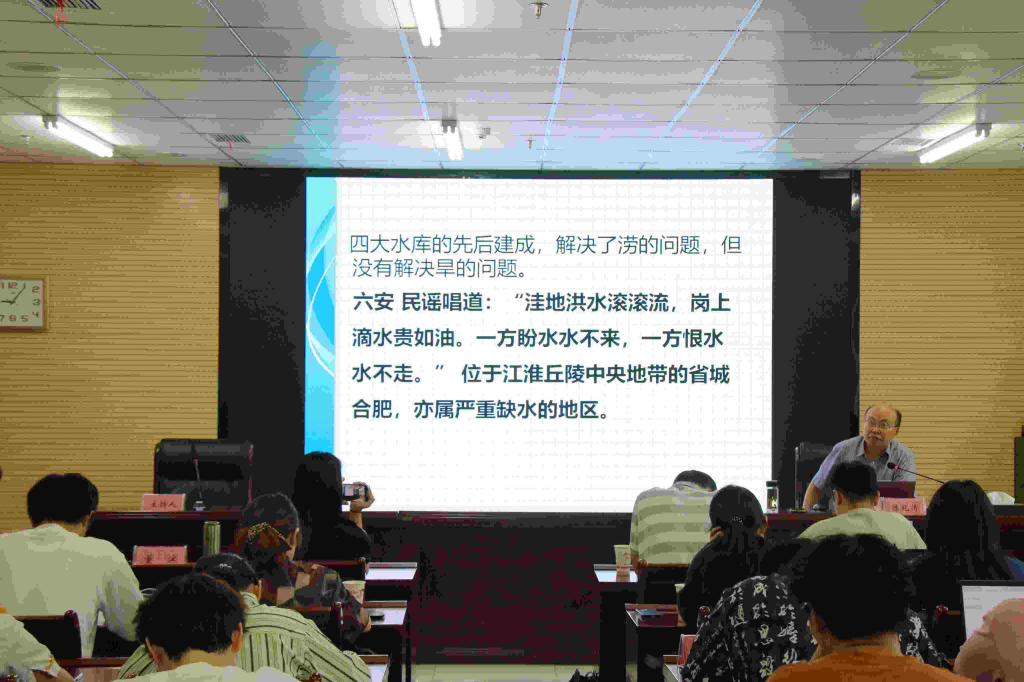 “古有都江堰,今有淠史杭”。淠史杭工程,是新中国成立后兴建的、有效灌溉面积仅次于都江堰的特大型综合利用水利工程。怀揣着敬仰之情,2024年7月14日,同济大学-六安“大思政”实践教学活动——暨同济大学、桂林理工大学、皖西学院本科生联合实习活动暑期社会实践团在中共六安市裕安区委党校综合楼三楼多媒体教室,一起聆听中共六安市委党校副校长、教授陈兆清对淠史杭的介绍。