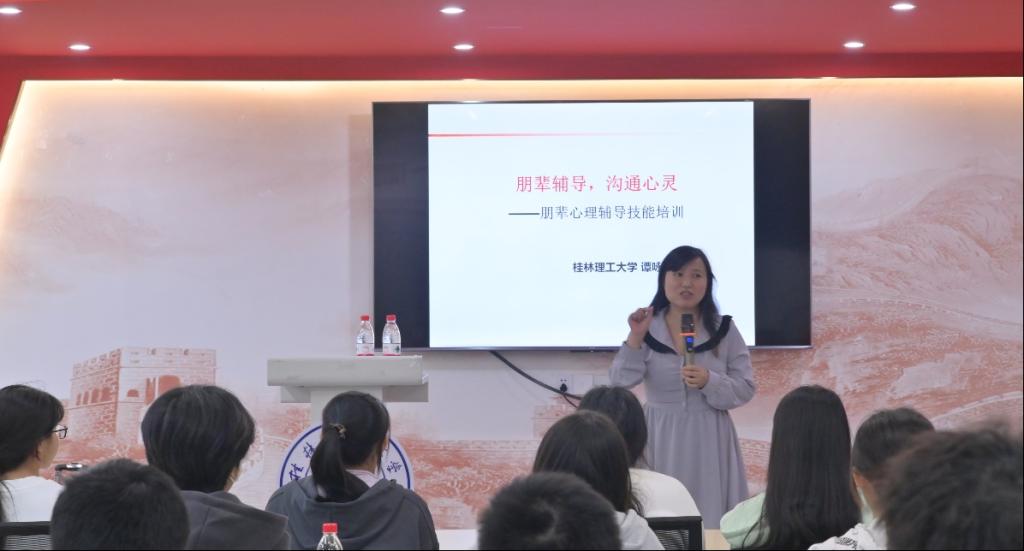 本期培训特地邀请了桂林理工大学的心理学副教授谭咏梅老师,来分享她对于朋辈心理辅导技能的心得与经验。谭咏梅老师借助大量的实例分析,形象生动地阐释了朋辈辅导的定义、基本态度以及基本技能。在培训会过程中,同学们踊跃回答老师提出的问题,现场氛围轻松幽默,和谐愉悦。此次培训会让心理委员对朋辈心理辅导技能有了更为深刻的认识。