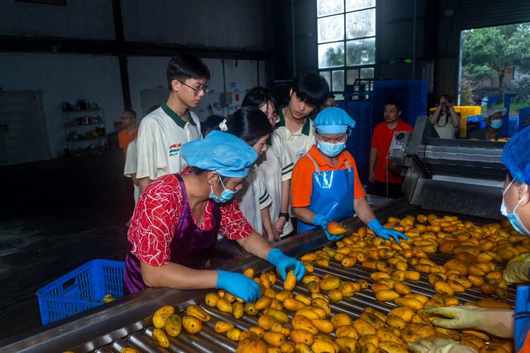 实践团参观车间工作人员芒果分拣过程
