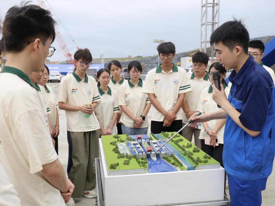 实践团首先与企石枢纽宣传部部长交流,结合沙盘模型及工程实景,系统掌握枢纽核心信息:作为平陆运河三座梯级枢纽的中段关键工程,企石枢纽位于广西灵山县陆屋镇企石村,核心通航设施为双线5000吨级省水船闸(尺度300米×34米×8米,最大运行水头27米),由上闸首、闸室段、下闸首及三级蓄水池构成,总混凝土浇筑量249万立方米。目前船闸主体已完成212.4万立方米混凝土浇筑,完成率85.3%,计划2026年底与运河同步通航;除航运功能外,还将承担供水、灌溉(覆盖20万亩农田)、防洪等综合任务,助力提升西部陆海新通道物流效率。