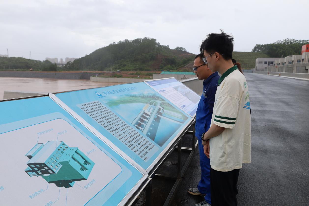 工作人员介绍,枢纽设计始终贯穿“生态优先”理念,同步推进主体工程与环境监测设施建设,针对咸淡水交汇可能影响鱼类洄游的问题,专门建设480米数控式鱼道——内设停歇“格子”、进出口停歇区,搭载监控与鱼类吸引设备,增设挡板保障泄洪时水流平缓,为鱼类开辟安全洄游路径。实践团结合环境学科专业,与枢纽综合办张主任围绕水质安全保障、施工期环境监测、生物多样性保护展开研讨。