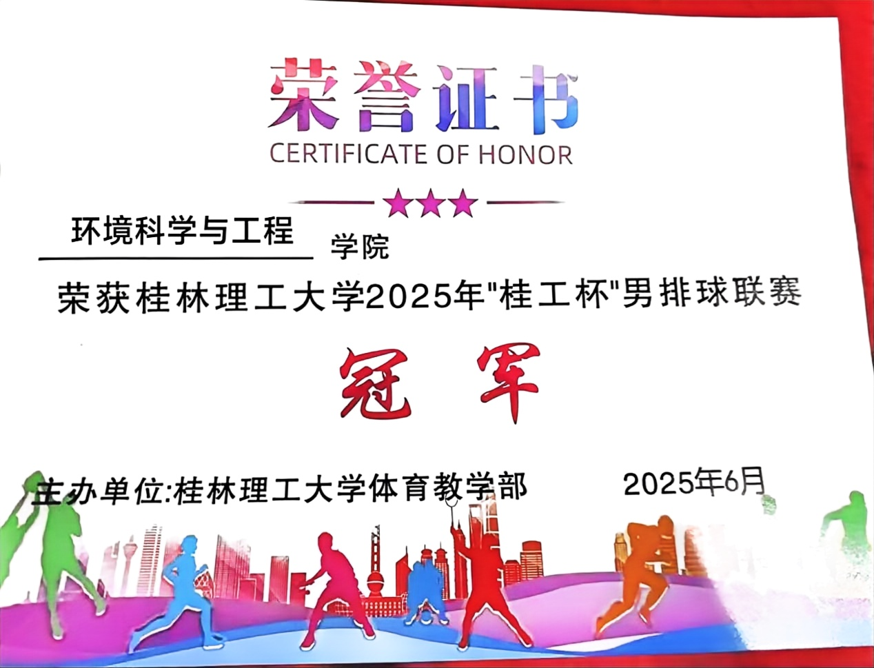 2025年4月,由桂林理工大学体育教学部主办,共青团桂林理工大学委员会、校学生会协办的2025年“桂工杯”男子排球联赛在雁山校区体育训练馆顺利落幕。经过激烈角逐,我院男子排球队力克群雄,勇摘桂冠!