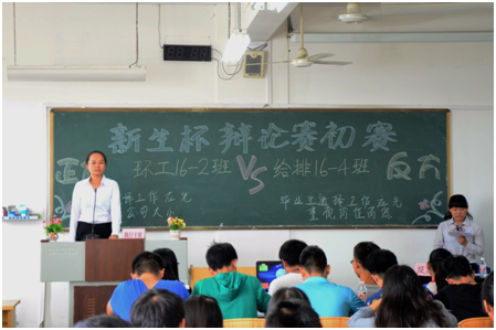 2016年10月22日9点,我院新生在雁山校区6栋201教室进行了新生杯辩论赛初赛的第一场比赛。此次辩论赛吸引了我院新生的广泛关注,各班同学踊跃报名,热情参与。本次辩论赛初赛第一场邀请到了我院辩论队队长冯源及优秀队员担任评委。比赛双方分别为环境工程16-2班和给排水16-4班,他们围绕“毕业生选择工作应先重视公司大小还是岗位高低”的辩题展开辩论。