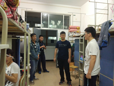 我院从本学期开始,积极组织全院宿舍长召开宿舍长例会,严抓宿舍环境卫生及安全隐患排查工作,经过大家的不懈努力,学院宿舍整体情况得到较大的改善。但在走访中发现还是有少部分同学在宿舍里没有注意卫生及用电安全,对此,田老师当面教育了这些同学及宿舍的宿舍长,宿舍是集体环境,构建文明校园,打造学习氛围浓厚、宿舍卫生环境良好的宿舍阵地是我们每一个环境学子应尽的义务,与此同时对于表现不好的同学,宿舍长及楼管委要有针对性地进行劝说教育,以提高宿舍卫生环境,提高我院宿舍整体水平。