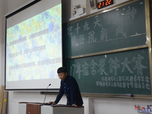 2017年11月24日晚19:30,学院“学十九大精神,筑环院新风”2017年宿舍装饰大赛决赛暨颁奖典礼在06206教室顺利举行。比赛邀请院团委副书记唐红兵老师、辅导员田明浩老师、贺旭霞老师以及我院团委学生会副主席钟仁智同学担任评委。