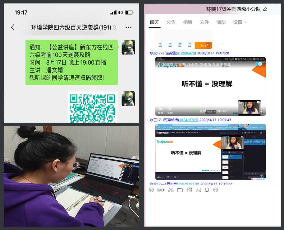 受新冠肺炎疫情影响,环境学院于2020年3月17日19:00进行线上英语四六级活动,为进一步加强和提高学生备考大学英语四六级的能力。本次活动由校外指导老师潘文婧主讲,我院此次参加四六级考试学生进行线上活动。