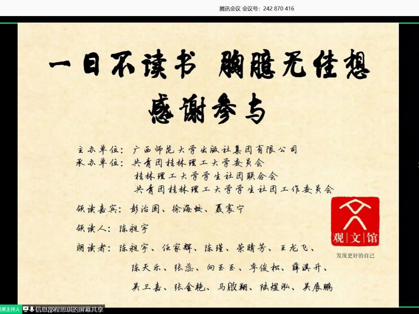 2020年4月23日晚20:00“致青春·为家国”第二届广西青少年经典云共读活动在腾讯会议APP举办。在防范抗击新型冠状病毒的关键时期,环院学子相约在线上共享阅读盛宴。