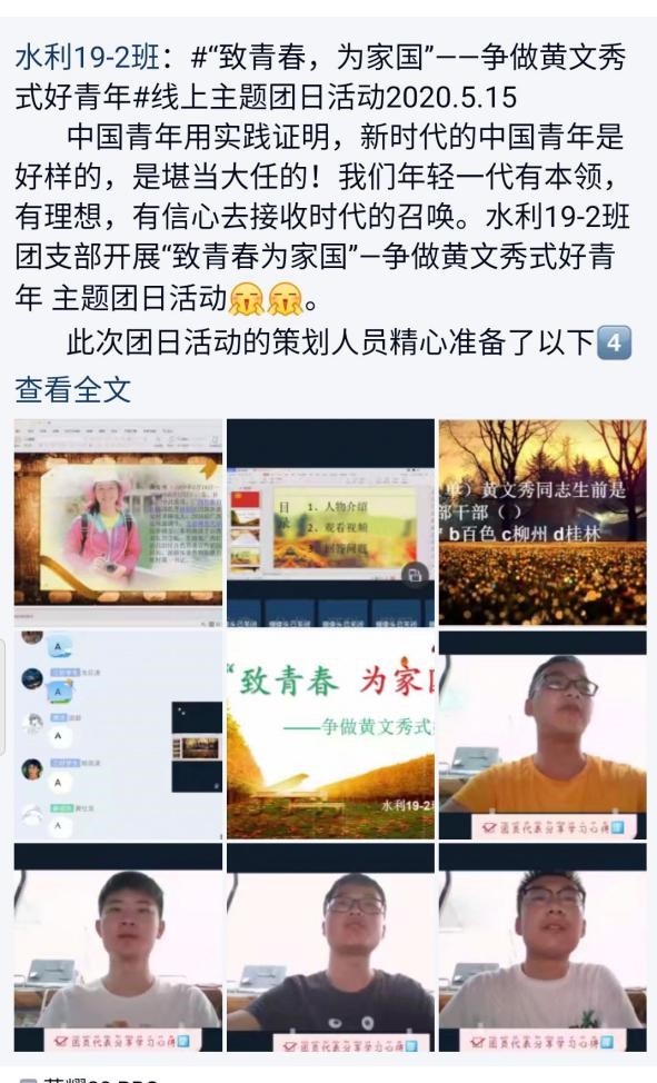 环境学院5月9日-5月16日期间组织开展了“致青春,为家国”—争做黄文秀式好青年主题团日活动。为切实开展好本次团日活动,许多团支部采用钉钉线上与QQ群聊的形式开展团日活动,也有部分团支部采取线下开展团日活动的形式,积极学习黄文秀书记相关事迹与精神。