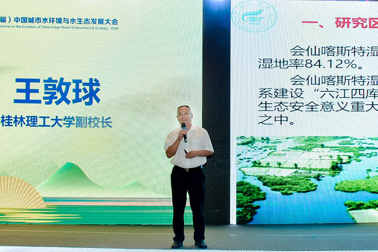 在热点研讨阶段,王敦球副校长以“喀斯特地区城市湿地中微量污染物的迁移化与分布规律”为题作了专题报告。
