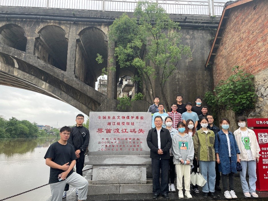 下午,一行人来到兴安县湘江战役界首渡口遗址和红军长征湘江战役纪念园,吴志强教授详细讲解了湘江战役渡江情况和革命先辈英勇悲壮的战斗历史,数万名红军将士浴血奋战、不畏艰险的英雄气概以及他们坚定的共产主义信念。 “数万将士血洒湘江,保护了党中央的安全,换得了遵义会议的召开,奠定了长征的胜利!战士们的鲜血染红了湘江,自此当地便有了“三年不饮湘江水,十年不食湘江鱼”的民谣。这就是1934年11月27日至12月1日,发生在广西北部著名的湘江战役”。学生们纷纷表示,今后的学习生活中将持续发扬湘江战役中坚持不懈的斗争精神,保持砥砺奋进的昂扬状态,困难再大,想想红军长征,想想湘江血战。