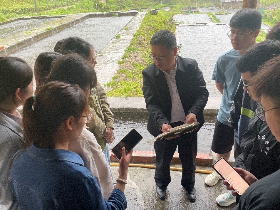 随后,一行人前往资源县中峰镇冷水鱼基地进行参观实习。基地负责人肖章息从冷水鱼基地基本情况、养殖专业特点与优势等方面进行了介绍。随后吴志强教授进行现场教学,向同学们介绍了虹鳟的分类特点以及在水产养殖中的前景,以鲜活的案例加深了同学们对冷水鱼养殖的认识,给同学们上了一堂生动的实践课。双方就学院相关专业人才培养方案如何进一步结合企业行业及社会需求进行调整完善进行了深入探讨,并就进一步开展合作达成一致意见,同时为桂林理工大学与资源县中峰镇冷水鱼基地教学科研合作基地揭牌。