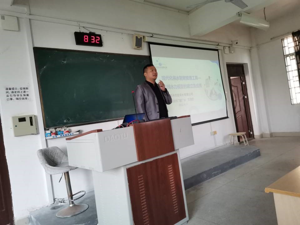 为提升些学生学习兴趣,拓展学生视野,提高学生实践能力,给排水专业邀请桂林市自来水公司城北水厂副长厂王浩然来我校雁山校区教6楼举行了授课活动,主要针对工程实际,讲授了桂林市管网建模过程与管网运行调度情况,在分享行业发展前景的基础上重点剖析了桂林市的供水情况,水力模型和管网管理,讲授结束后,王老师和同学们进行了深入的交流,为同学们解答了有关工程实践方面的困惑,强化了学生对本专业的认知度,增强了自身所学专业未来发展的信心,体会到了专业理论知识的实用性。