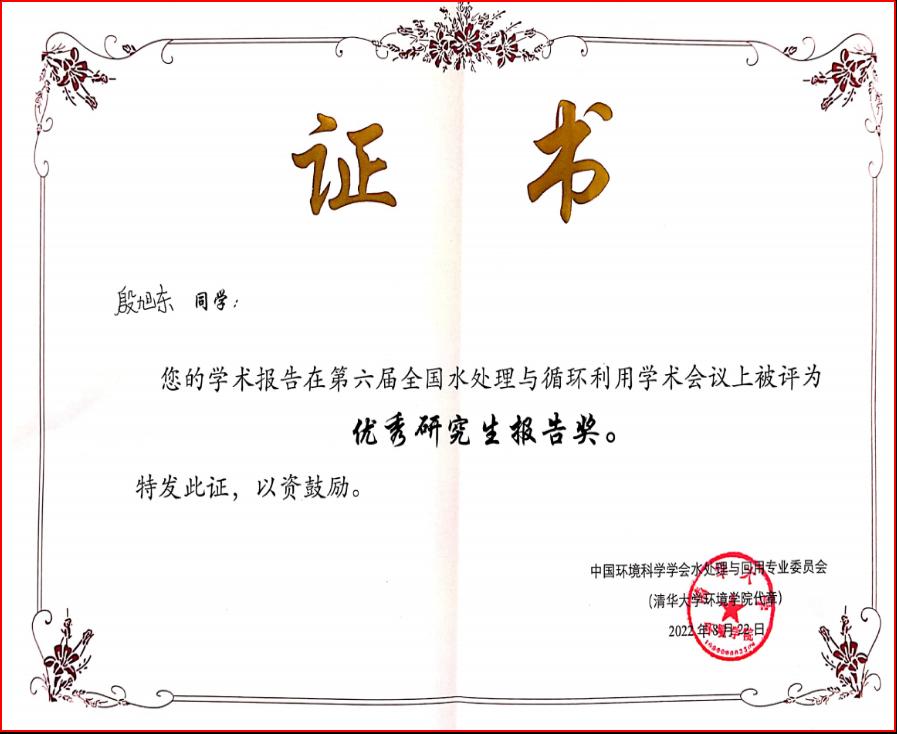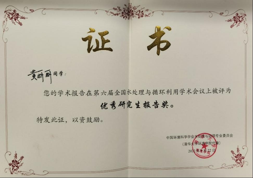 会议共设置了二十四个分会场,100余位来自全国知名高校、科研院所及行业代表性企业的专家学者,围绕水处理与循环利用领域的前沿科学问题、关键技术、工程实践和政策管理等内容做了精彩的报告。会场学术气氛浓厚,一批水处理与循环利用领域的高水平研究成果在会上得到了充分的交流。会议设置了优秀研究生专场,我院李艳红研究员和黄亮亮教授分别担任分会场主席和负责人。会议收到来自全国各大高校研究生们数百份的投稿,经过专家评审,组委会从投稿中优选出23个报告,分两个分会场同时进行现场展示,我院2位博士研究生殷旭东和黄丽丽分别以“磷掺杂 g-C3N4/Bi2WO6 异质结的制备及其可见光催化性能研究”和“硅藻基Cd(II)表面离子印迹聚合物的制备、表征及吸附特性”为主题在分会场做了汇报交流,并都获得“优秀研究生报告”奖。