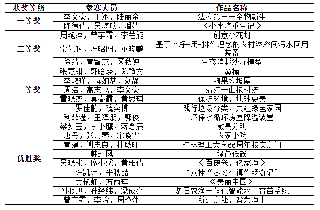 2022年11月22日,由环境工程教研室举办的以环保科技创意设计大赛于萃华楼12407进入了教师评审阶段。全校学生经过1个月的准备阶段共提交参赛作品218份,参赛作品数量再创历年新高。今年的参赛作品类型多以实物作品和海报为主,充分彰显出学生的创新意识。本次竞赛不仅得到了环境科学与工程学院学生的热烈响应,还受到了信息科学与工程学院、公共管理与传媒学院、土木建筑与工程学院等全校多个学院学生的积极参与,充分调动了全校学生的积极性,同时激发出不同专业学生在环保领域的新观念、新方法和新技术,促进了各专业与环保理念的融合。各位评审老师根据作品的科学性、创新性和实用价值,共评出一等奖2组、二等奖3组,三等奖5组,优秀奖10组。具体获奖名单如下: