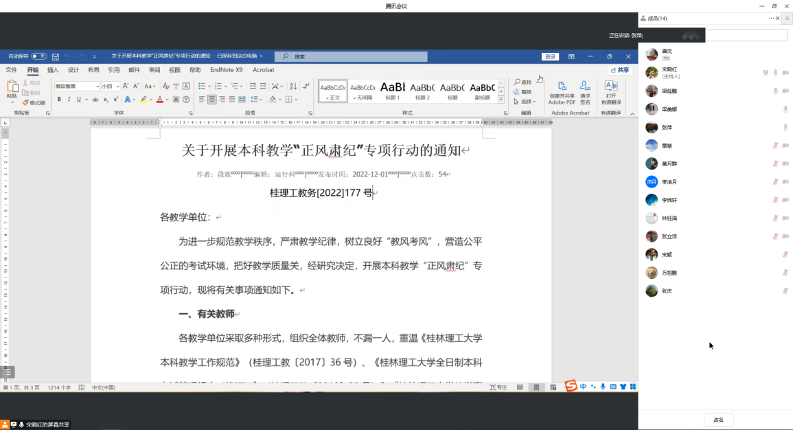 专任教师集中学习了《桂林理工大学本科教学工作规范》(桂理工教〔2017〕36号)、《桂林理工大学全日制本科考试管理规定(修订)》(桂理工教〔2019〕20号)和《桂林理工大学教学事故认定与处理办法》(桂理工教〔2010〕3号)等规章制度。学生通过召开主题班会等形式重温了《桂林理工大学学生学习管理规定》(桂理工教〔2009〕27号)、《桂林理工大学全日制本科考试管理规定(修订)》(桂理工教〔2019〕20号)等规章制度。通过开展此次专项行动,教师的教学工作规范意识进一步加强。学生的上课迟到早退减少,考试无作弊现象,学习气氛更加浓厚。 环境学院“正风肃纪”专项行动取得了初步的效果。