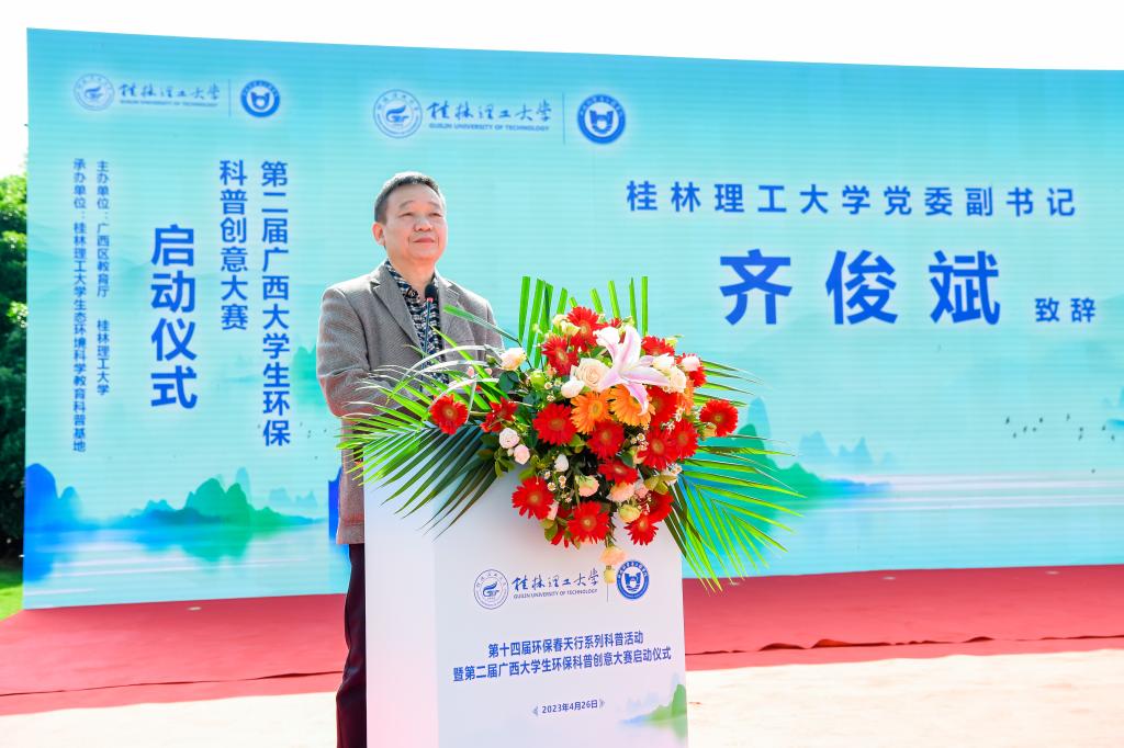 齐俊斌在致辞中向出席活动的嘉宾朋友们和老师、同学们表示诚挚地欢迎。他指出建设生态文明是中华民族永续发展的千年大计。高校作为人才培养主阵地、服务社会战略高地,加强生态文明教育,推动环保知识科普,增强青年大学生环境保护意识和行动自觉,引领带动社会更加积极地践行人与自然和谐共生理念,是光荣的使命和义不容辞的责任。我校作为广西首批绿色学校,以及广西唯一同时拥有环境科学与工程一级学科博士点和博士后流动站的高校,在环保领域人才培养、科学研究和科普教育等方面拥有雄厚的实力、积淀了丰富的经验,有能力也有义务承担起地区生态文明研究任务,为地区经济社会可持续发展保驾护航。他强调,学校一定要把这次活动打造成人才培养的新阵地、服务百姓的新平台、引领生态文明实践的新品牌,进一步增强学校和广西的良性互动,有效提升学校服务能力和百姓生活质量,推动学校与外界深度融合发展,为建设新时代中国特色社会主义壮美广西增光添彩。