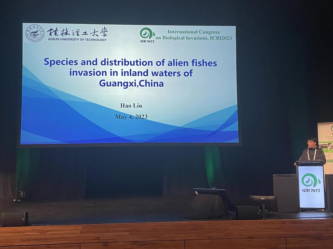 大会上,博士研究生何佳洋在“Risk assessment”专题作了题为“Risk analysis of alien fishes invasion in inland waters of Guangxi, China” 口头汇报,该成果为广西内陆水域的外来鱼类入侵早期防治和管理提供科学依据;博士研究生刘昊在“Environmental impacts”专题作了题为“Species and distribution of exotic fishes invasion in inland waters of Guangxi”的口头汇报,主要介绍了广西内陆水域的外来鱼类入侵较为严重,需严控人为引种、养殖和传播、加强外来鱼类的预警和监测等防控对策。