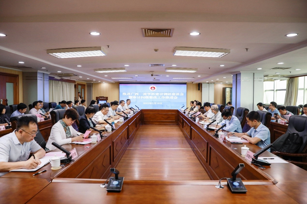 2023年5月18日上午,自治区教育厅在广西医科大学召开广西一流学科建设调研座谈会暨审计问题整改工作推进会。自治区教育厅副厅长金祖权出席会议并讲话,自治区教育厅科研管理处副处长杨曦主持会议。我院院长曾鸿鹄教授和副院长黄亮亮教授参加了此次会议。