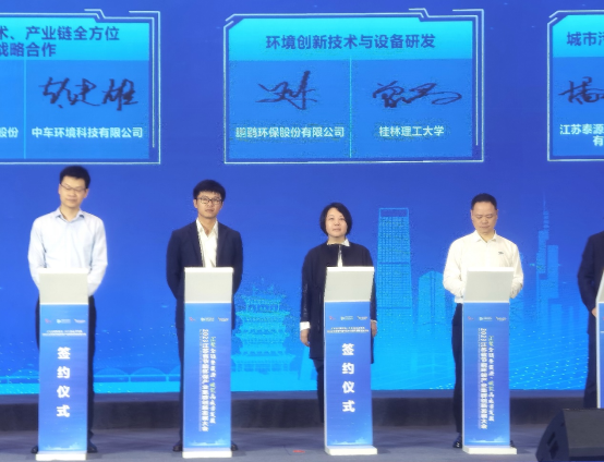 开幕式上,我校环境科学与工程学院与鹏鹞环保股份有限公司作为校企合作代表,在环境创新技术与设备研发方面达成合作协议。曾鸿鹄院长与王鹏鹞总裁现场上台签约,我校王敦球校长、曲久辉名誉校长现场鉴签。