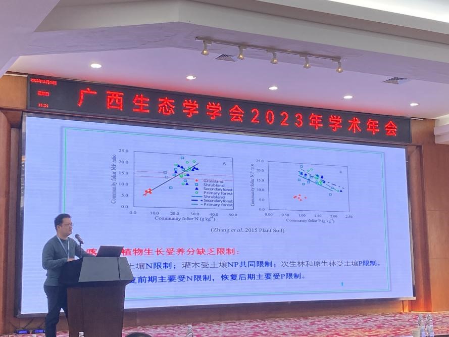 2023年11月25-27日,由广西生态学学会主办,广西科学院生态环境研究所、广西师范大学生命科学学院、广西漓江流域景观资源保育与可持续利用重点实验室、珍稀濒危动植物生态与环境保护教育部重点实验室联合承办的广西生态学学会2023年学术年会在广西桂林市举办。我院黄亮亮教授、潘复静副研究员、马捷博士与博士研究生参加了本次会议。