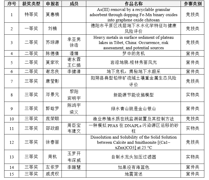 本次大赛所设参赛作品分为宣传类、竞技类和实物类,得到了桂林理工大学各学院师生的广泛关注,共有50余份作品参加此次竞赛。竞赛由地下水科学与工程教研室的危嵩老师、赵雨晴老师和陈盟老师组成评审组,着重针对参赛作品的专业契合度、作品的科学性与创新性、以及作品的实际应用价值等进行评审。根据奖项设置,经由评审组老师们打分评选出特等奖1项、一等奖1项、二等奖4项和三等奖9项。