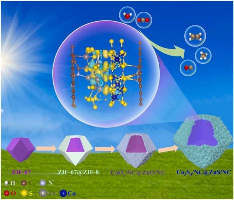 太阳能驱动CO2还原被认为是缓解化石燃料短缺和环境危机的有效途径,其关键在于开发合理的光催化剂来解决活性位点不足和缺乏定向电荷转移通道等问题。考虑到单组分催化剂中光生载流子快速复合和光催化活性较低等问题,该研究工作从异质结界面工程策略入手,系统地设计特殊结构的催化剂来促进光生电荷的分离和转移,从而提高光催化活性。本研究工作构建的一种核壳Co3S4/NC@ZnS/NC异质结催化剂由于其独特的组成和结构,具有增强的CO2吸附能力和优异的可见光吸收能力。此外,实验和DFT计算证实了核壳异质结中形成的ZnS/NC作为电子传输层,可调节电子结构,从而促进载流子的分离和转移。在可见光照射下,Co3S4/NC@ZnS/NC催化剂在CO2转化为CO、CH4和C2H4方面展现出比Co3S4/NC和ZnS/NC催化剂更优异的光催化性能。