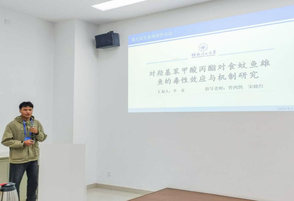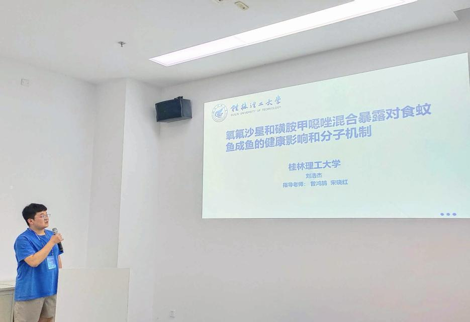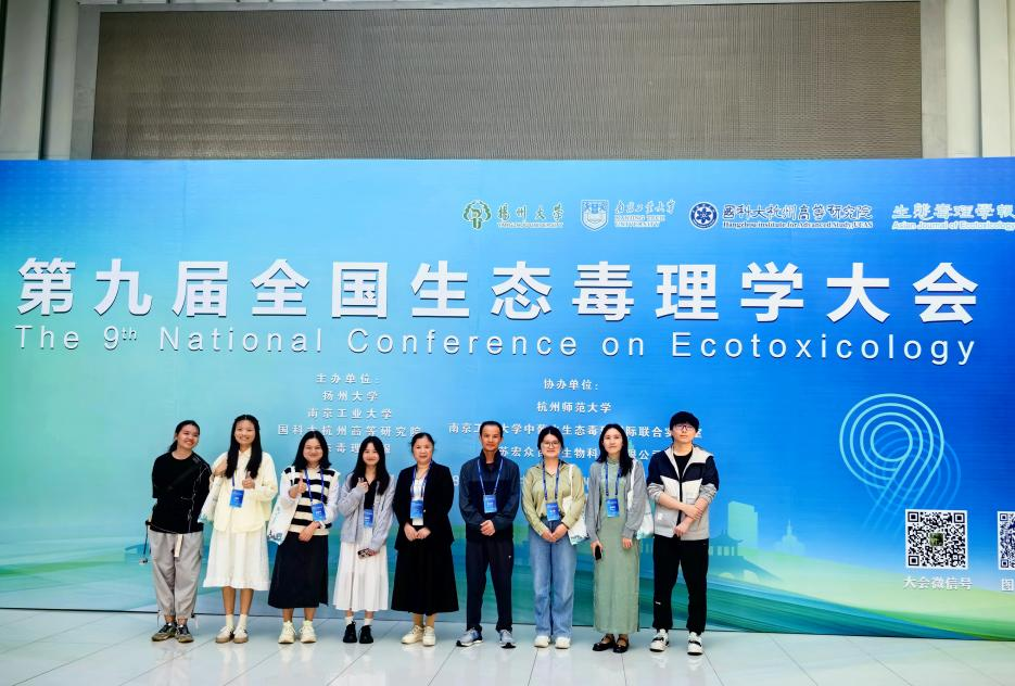 我院莫凌云研究员和覃礼堂教授带队参会。研究生黄永香、庄雅雯、杨茜、李重、刘浩杰分别以《唑类杀菌剂复合污染物对近头状尖胞藻的联合毒性作用评估》、《会仙湿地睦洞湖水系表层沉积物时空分布特征及其污染风险评价》、《探究低浓度恩诺沙星对抗生素抗性基因向大肠杆菌水平转移的影响与机制》、《对羟基苯甲酸丙酯对食蚊鱼雄鱼的毒性作用与机制研究》、《氧氟沙星和磺胺甲恶唑混合暴露对食蚊鱼成鱼的健康影响和分子机制》为题作了汇报交流;硕士研究生雷雨雪、龙思彤、郭美莎作了墙报展示,题目分别为《5种唑类杀菌剂对蛋白核小藻的联合毒性与机理研究》、《喹诺酮类抗生素对Q67时间毒性的定量-构效关系研究》和《The health effects assessment of pollutants on fish using Non-invasive Micro-test Technology》。