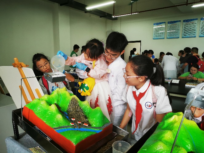 在志愿者的讲解和带领下,同学们依次参观了漓江鱼类多样性和生态保护展区、垃圾分类与处置展厅、噪声与辐射控制体验厅、垃圾焚烧与废气治理工艺展厅、水污染控制工艺展厅等10余个展厅,学习了水污染防治、大气污染防治、垃圾污染防治等方面的知识和技术。在环保科普趣味实验交互厅,同学们开展了“水被污染了”、“活性炭的魔法”、“会变大的气球”、“泥石流”、“美丽的仙境”、“砂滤的作用”、“污泥里的世界”等小实验,在欢声笑语中学习了微生物的作用、活性炭净水原理、二氧化碳的性质、泥石流的形成等科学小知识。本次研学活动,不但让同学们学习了环境保护的科学知识,也提升了他们的环保理念和意识。