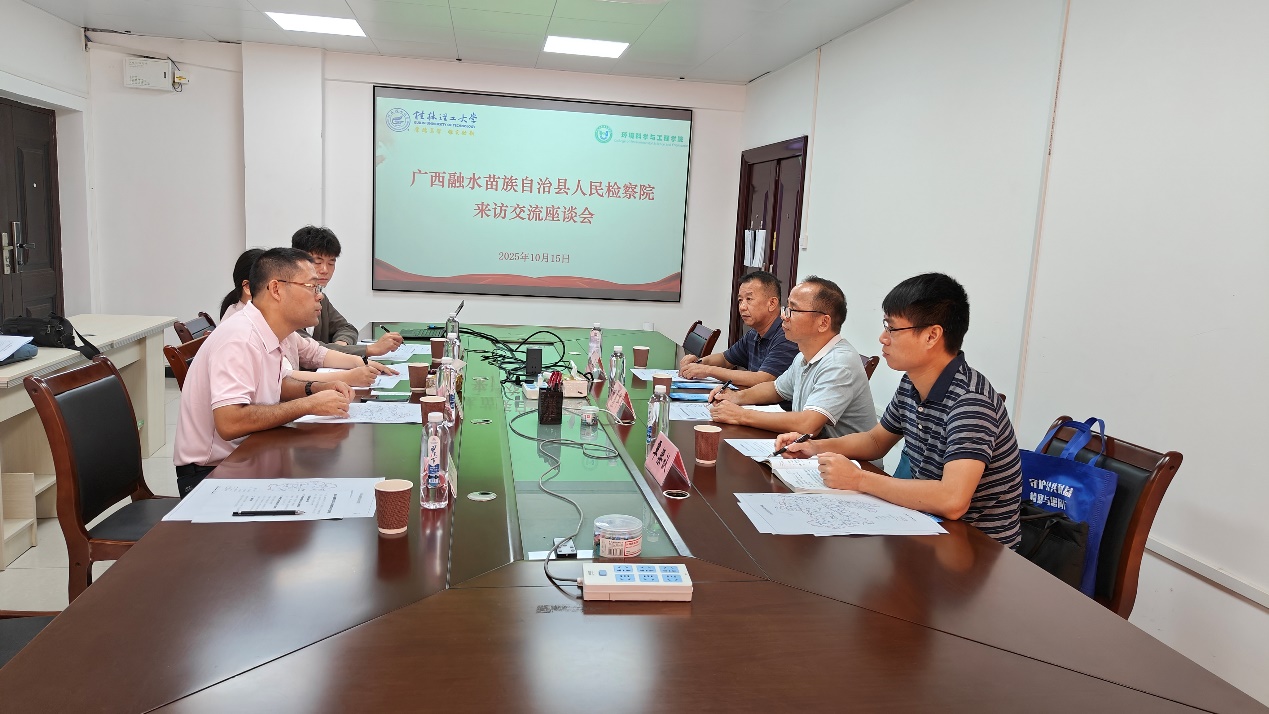 2025年10月15日上午,广西融水苗族自治县人民检察院何勇军副检察长一行3人到访我院进行交流。我院副院长黄亮亮及相关师生代表参加了座谈会。