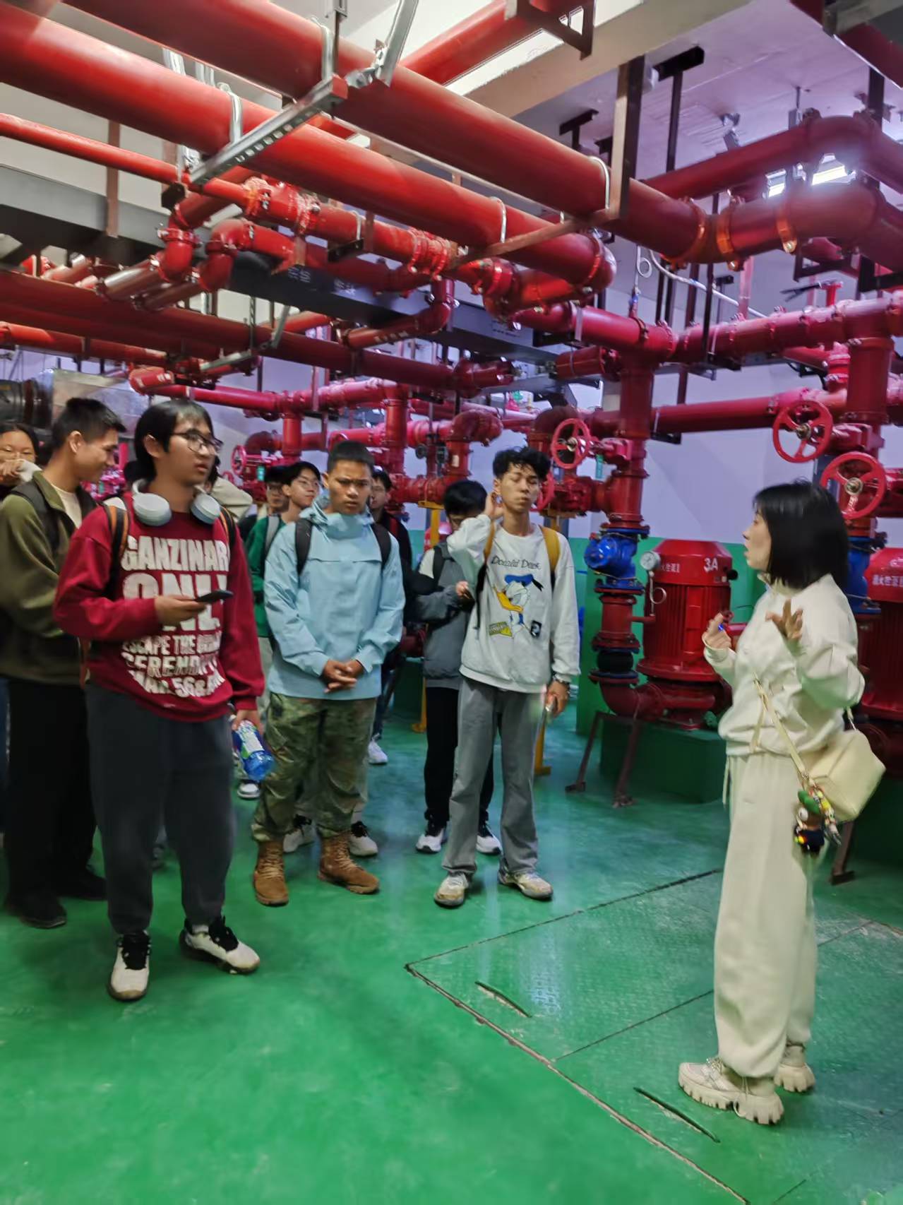 为确保实习活动取得实效,给水排水教研室与桂林建筑规划设计集团市政设计院党支部通力配合,精心谋划、周密组织,安排“三金广场”项目负责人与相关专业技术骨干组成高工讲师团。考虑到学生人数较多,分上、下午两批,为130余名师生全程提供精准化、专业化讲解。在项目现场,桂林建筑规划设计集团市政设计院讲师团以“一线课堂”形式,打破传统理论教学模式,将枯燥的专业知识转化为生动鲜活的工程实践案例。围绕“三金广场”项目设计施工,从项目整体设计理念、系统统筹规划的宏观视角切入,逐步深入到精细化设计、设备科学选型、技术创新以及施工遇到的问题、难点等。通过“理论+实践”的讲解方式,让学生们清晰地理解图纸中的线条如何转化为现实中的复杂工程系统,课堂上学到的专业知识如何在复杂工程场景中灵活运用,有效打通了理论知识与实践应用的盲区。