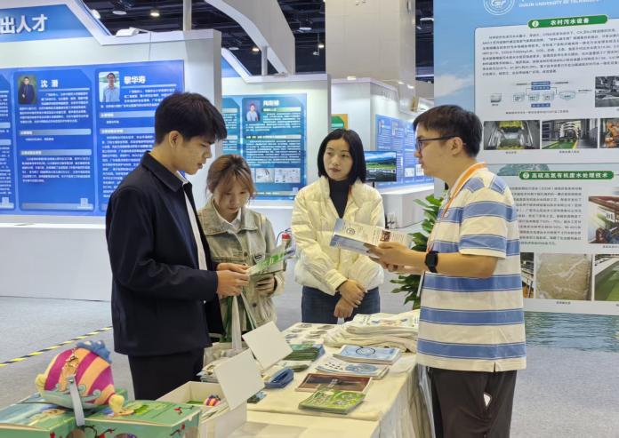展会现场,桂林理工大学环境科学与工程学院老师及志愿者们与中外嘉宾交流洽谈、讲解水处理功能材料与装备创新成果,互动热烈