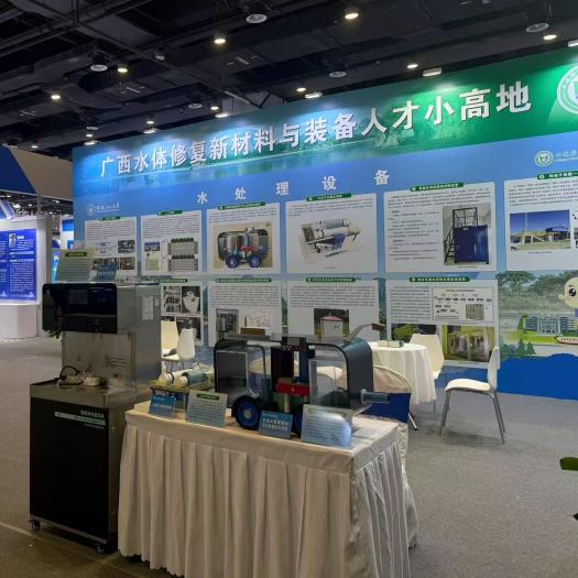 展会现场,广西人才小高地展位以“山水相融”的设计理念吸引众多观众驻足。展区以“水处理功能材料”与“水处理设备”为核心,通过实物模型演示、展板静态展示等形式,系统呈现了环境科学与工程学院在水污染治理、资源循环利用等领域的创新成果。其中,“水处理功能材料”系列展板呈现植物遗态改性、复合活性、功能膜三大类创新材料,每款材料都通过电镜图、性能曲线和实物展示呈现完整研发链条。“水处理设备”系列展板则聚焦技术落地,展示涵盖城乡污水、工业废水、海水淡化等全场景的11类定制化装备,其中“外源厌氧氨氧化污水处理技术装置”因“零碳源添加、降本增效”成为咨询热点。