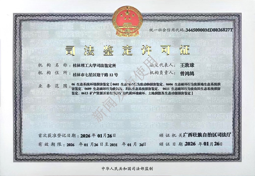 桂林理工大学司法鉴定所成功取得司法鉴定许可证,16名核心成员均顺利获得生态环境损害鉴定执业资格。执业范围涵盖五大类:生态破坏行为致动物损害鉴定;生态破坏行为致湿地生态系统损害鉴定;生态破坏行为致河流、湖泊生态系统损害鉴定;生态破坏行为致农田生态系统损害鉴定;矿产资源开采行为致矿山地质环境破坏、土地损毁及生态功能损害鉴定。这一资质的落地,填补了我校在生态环境损害司法鉴定领域的空白,为生态环境司法公正、生态保护修复提供了专业技术保障。