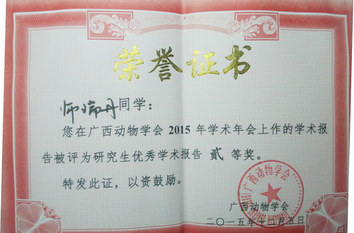2015年12月5日,在钦州学院召开广西动物学会第九届会员代表大会及学术年会,我院博士生导师吴志强教授、黄亮亮博士带领研究生参会。环境科学与工程专业2015级博士研究生邹琦、环境科学与工程专业2013级硕士研究生师瑞丹、丁洋、封文利以及环境工程2014级硕士研究生尹超等分别作了口头报告,向与会代表介绍了目前该课题组的研究成果,师瑞丹同学还获得学生组口头汇报二等奖。 最后经投票选举,我院黄亮亮博士当选为广西动物学会第九届理事会理事。