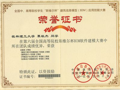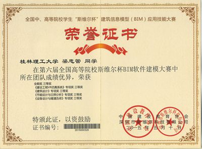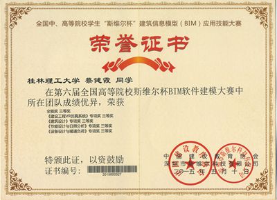 由我院2012级给排水科学与工程专业学生组成的“创新”队参加了于2015年5月9-10日举行的第六届全国中、高等院校学生“斯维尔杯”建筑信息模型(BIM)应用技能大赛决赛。获得了4个专项(建筑工程VR仿真系统、建筑设计、节能设计与日照分析、设备设计与暖通负荷)三等奖,1个全能三等奖的好成绩。