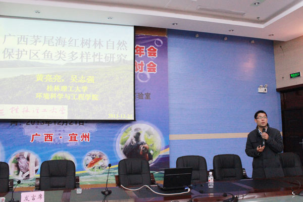 本次研讨会共组织了14个学术报告,我院黄亮亮老师以吴志强教授课题组近年对红树林鱼类多样性保护的研究成果为素材,以“广西茅尾海红树林自然保护区鱼类多样性研究”为题目向大会作了报告。此外,本次会议就学会的组织工作、学术活动、财务状况及存在的问题展开激烈讨论,并明确了广西动物学会2014年的工作计划,工作重点是桂林理工大学将于2014年5月中下旬举办第八届南方六省(湘、鄂、赣、粤、桂、琼)动物学会学术研讨会,广西师范大学将于2014年11月中旬举办全国野生动物生态与资源保护学术研讨会。