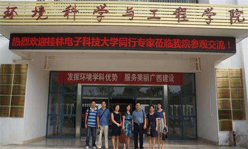 9月13日,桂林电子科技大学生命与环境科学学院李桂银教授等一行四人到我院交流考察,并实地考察了国家级水污染控制实验教学示范中心和环境工程中心实验室。我院游少鸿副院长、环境工程与环境科学系主任黄亮亮以及环境工程中心实验室主任李艳红陪同考察;双方就环境学科建设、本科生和研究生的培养方案、实验和实践环节开设、实验室的设备购置、日常管理、规章制度等方面的工作经验进行了交流。