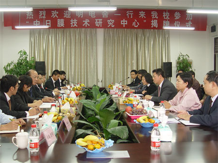 在雁山校区学院会议室里,张学洪校长与和地彰总监举行了座谈。张校长首先代表学校对和地彰一行的到来表示热烈的欢迎,并介绍了我校教学科研概况以及我院环境学科在广西有机废水处理技术领域的优势与特长,最后预祝“中日膜技术研究中心”合作项目顺利开展,并取得优异的科研成果和实用价值。随后,和地彰总监简要介绍了日本株式会社明电舍的情况,对我校为研究中心的成立所付出的努力表示诚挚的感谢,表示将与我校加强科研合作与技术交流,并努力在项目研究中做出成果和贡献。