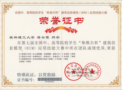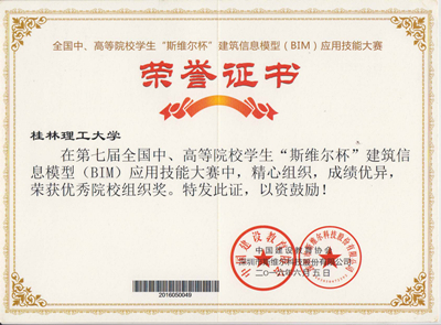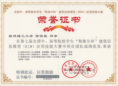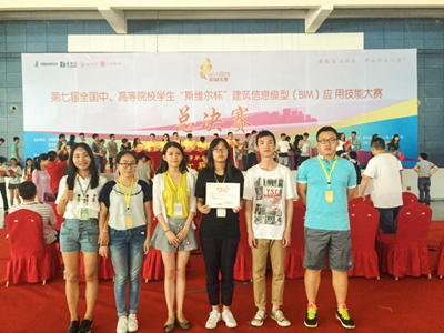 2016年6月3日-8日,第七届全国中、高等院校学生“斯维尔杯”建筑信息模型(BIM)应用技能大赛分别在四川大学、山东建筑科技大学举行,本届比赛共有432所高校代表队的参与了本次比赛的角逐,经过专家组的认真评审与我校学子优秀竞答,我校环境科学与工程学院徐佳维等5名同学组成的“小霸王学习机”代表队分别获《工程设计专项(含建筑设计、结构设计、设备设计)》和《工程管理专项(含项目管理与投标工具箱)》2个全国专项二等奖,《工程造价专项(含土建算量、安装算量、清单计价)》全国专项三等奖和1个 全能三等奖的好成绩,并获得了本届比赛的优秀组织奖。