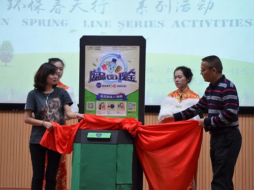 与会人员一同观看了历年“环保春天行”系列活动的视频回顾以及即将在校园推广的CUC智能固废回收终端的视频介绍。伴随轻快的音乐律动,王敦球副校长与何艾莉女士上台为CUC智能固废回收终端揭幕并移交。何艾莉女士代表环保创客联盟为活动致词,她指出CUC智能固废回收终端是传统的垃圾分类与“互联网+”结合的产物,对桂林理工大学环境学院率先在广西开展“环保生活高校行”活动表示欢迎和感谢。环工14实验班陈强同学作为学生代表发起环保倡议,他呼吁同学们从身边小事做起,在垃圾分类和环境保护等方面贡献自己的力量。