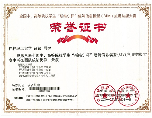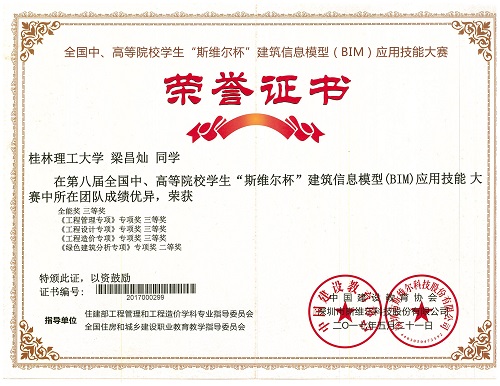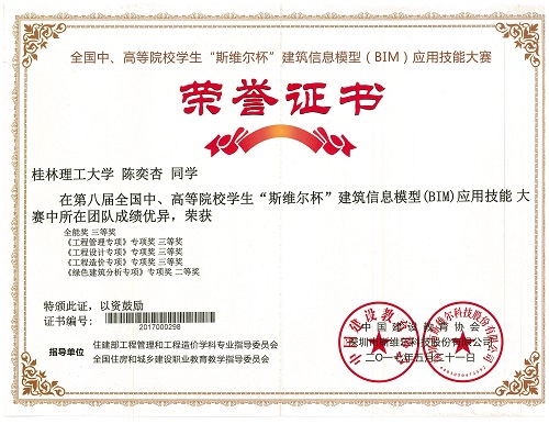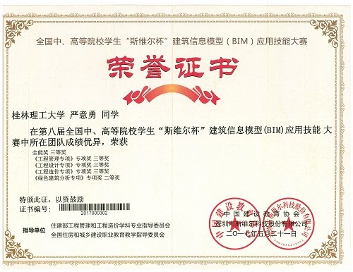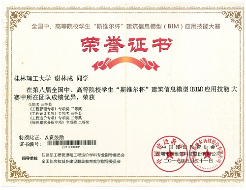 近日,第八届全国中、高等院校学生“斯维尔杯”建筑信息模型(BIM)应用技能大赛决赛于5月20、21日在浙江理工大学(南方赛区)和吉林建筑大学(北方赛区)举行,共有来自全国453所学校的457支参赛队伍(其中南方赛区307支)参加,是该赛事举办以来规模最大、参赛院校最多的比赛。经过参赛选手们激烈的角逐和专家组的认真评审,我院给排水科学与工程专业梁昌灿等5名同学组成的“叽叽歪歪”代表队表现突出,分别获《绿色建筑分析专项》1个全国专项二等奖,《工程设计专项》、《工程造价专项》和《工程管理专项》3个全国专项三等奖和1个全能三等奖的好成绩。我院获本届比赛的优秀组织奖。
