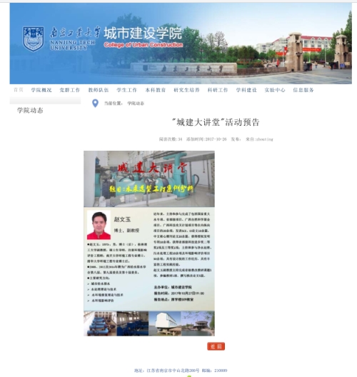 2017年10月27日,我院赵文玉副教授应南京工业大学城市建设学院市政工程系的邀请,做了“水泵选型工程案例分析”的专题讲座(http://csjsxy.njtech.edu.cn/view.asp?id=2705&class=672),围绕实际工程中水泵运行过程中存在问题的分析、解决过程,结合泵与泵站课程知识点展开,开拓学生视野,启发解决问题的思路,讲座气氛活跃,学生反响良好。
