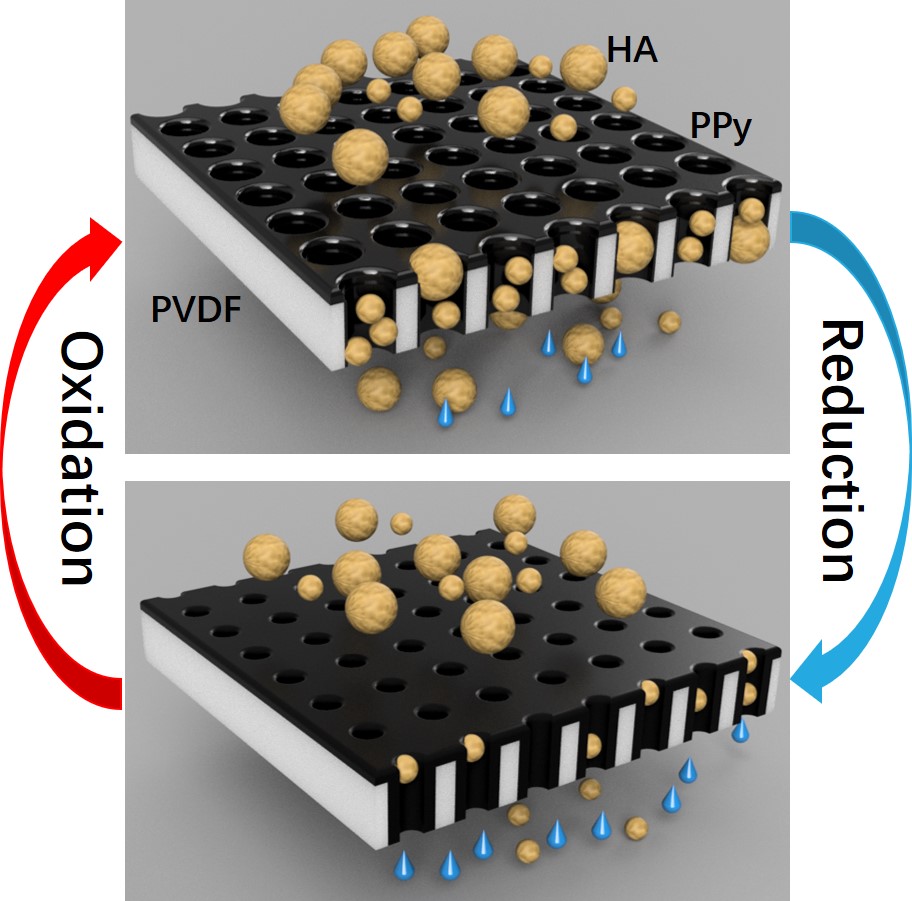 近日,我院博士生谭笑在中国科学院生态环境研究中心曲久辉院士团队的指导下,设计合成了用于抗污染和选择性分离的电响应导电聚合物膜。相关研究成果以标题“Electrically Pore‐Size‐Tunable Polypyrrole Membrane for Antifouling and Selective Separation”在线发表在国际高水平期刊《Advanced Functional Materials》(中科院分区一区top,2018年影响因子15.621)。