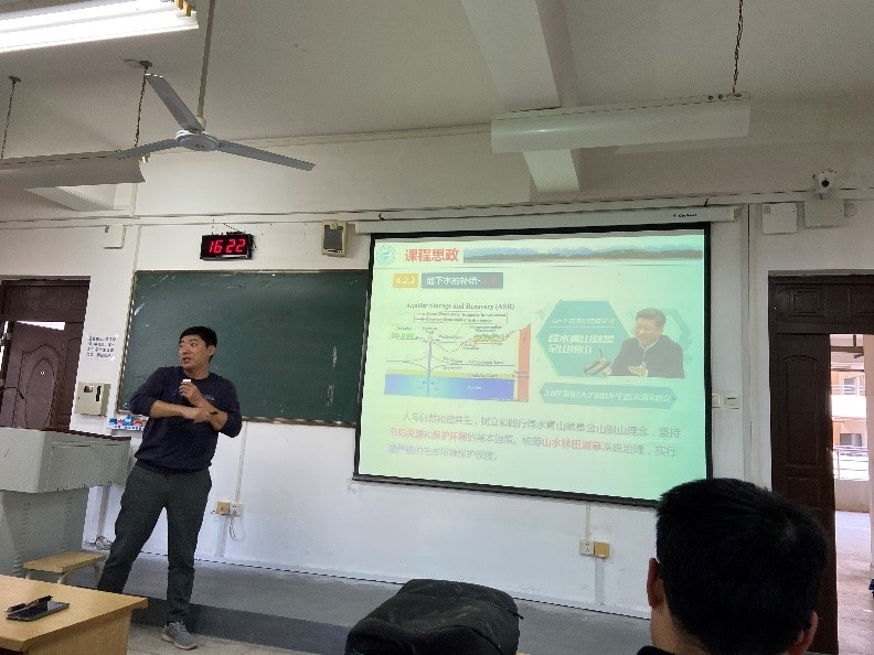 授课过程中,胡荣庭老师立足课程教材围绕地下水排泄内容展开教学。胡老师结合实际案例,采用图文并茂的方式向学生讲解了相关知识点。授课中,胡老师与学生相互沟通,通过观察学生的反应,实时控制讲课的进度与节奏。在整个教学过程中,胡老师思路清晰,教学重点突出,教学过程流畅,并注重课程思政育人,将课程思政内容较好地融入课程之中,有很好的课题教学效果。