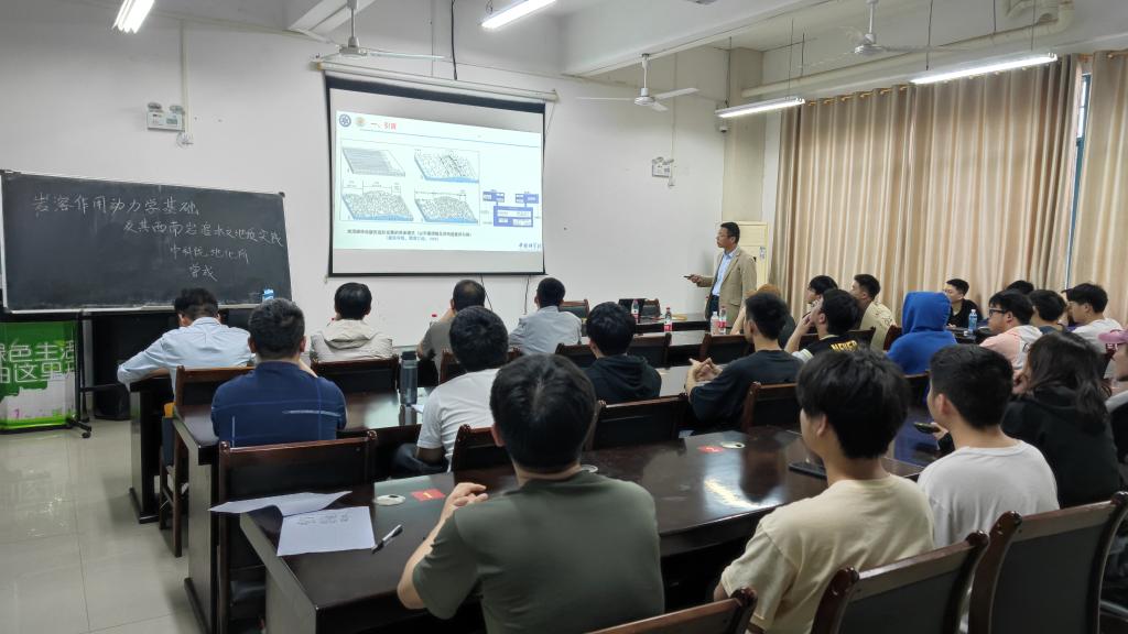曾成副研究员重点介绍了岩溶动力系统、岩溶作用动力学、西南岩溶水文地质实践及有关古表生岩溶缝洞型油藏勘探开发的思考,旨在通过现代岩溶模式框架的构建来突破传统岩溶水文地质研究的局限性,促进塔里木盆地海相碳酸盐岩缝洞型储层的古岩溶形成机制研究,最终实现岩溶区生态、社会、经济的协调和可持续发展。曾成副研究员通过岩溶水文地质最新成果及相关的工程实践经验的介绍,拓宽了学生的视野,激发了学生对专业的科研兴趣。