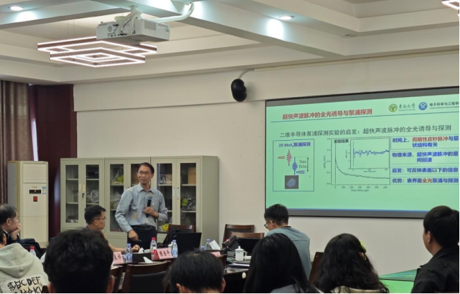 报告会上,徐春祥教授先为同学们讲述了东南大学的校史。东南大学历史悠久、声誉卓著,在长期的办学过程中,积累了丰富的学术资源和深厚的文化底蕴。报告中,徐春祥教授深入探讨了超级光谱技术在低维表界面研究中的应用。从荧光和发光原理出发,详细阐述了材料特性与光谱检测之间的紧密联系。特别指出,通过TRPL时间信息和空间信息的分析,能够深入探究样品厚度与检测结果的关系,以及缺陷的空间分布情况。在研究中,飞秒光谱泵激发技术发挥了关键作用,为揭示低维材料的深层界面结构提供了有力手段。对于周期性层状结构的研究,超快声波脉冲技术的应用犹如一把钥匙,打开了了解其内部结构和特性的新大门。通过打出声音和对声波的分析,清晰呈现了其内部的复杂结构。
