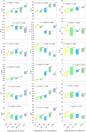 北部湾三种不同大小鱼类C、N、P含量及比值箱线图(不同的小写字母表示显著差异(P < 0.05))