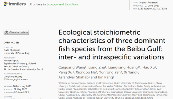 环境科学与工程学院水域生态学组于2022年春季(4月)对北部湾三种优势鱼类多齿蛇鲻(Saurida tumbil)、大头白姑鱼(Pennahia macrocephalus)和黄带绯鲤(Upeneus sulphureus)进行了调查,分析了北部湾3种优势种鱼类的C、N、P、Ca、δ13C和δ15N元素含量。结果表明,三种鱼体内元素(C、N、P和Ca)的变异范围分别为36.73 ~ 49.24%、8.79 ~ 13.99%、1.11 ~ 2.78%和1.16 ~ 4.58%,其中P含量的变异最大,导致了鱼体内C:P和N:P的变异。相关分析表明磷含量的变化与鱼骨和鱼鳞的形成有关。三种鱼的C、N、P含量及其比值与体长和δ13C显著相关,表明C:N:P浓度的变化是由个体发育和食物来源引起。本研究发现,这三种鱼的身体化学计量存在显著的种间和种内差异,主要是由于身体大小和饮食的差异。水生生物在形态和饮食方面经历了个体发育波动,从而改变了它们的化学计量特征。